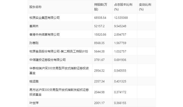 一季报显示,2024年一季度末公司十大流通股东中,新进股东为易方达沪深300交易型开放式指数发起式证券投资基金,取代了上年末的蔡敏。在具体持股比例上,牧原实业集团有限公司、香港中央结算有限公司、华泰柏瑞沪深300交易型开放式指数证券投资基金持股有所上升,中信建投证券股份有限公司持股有所下降。