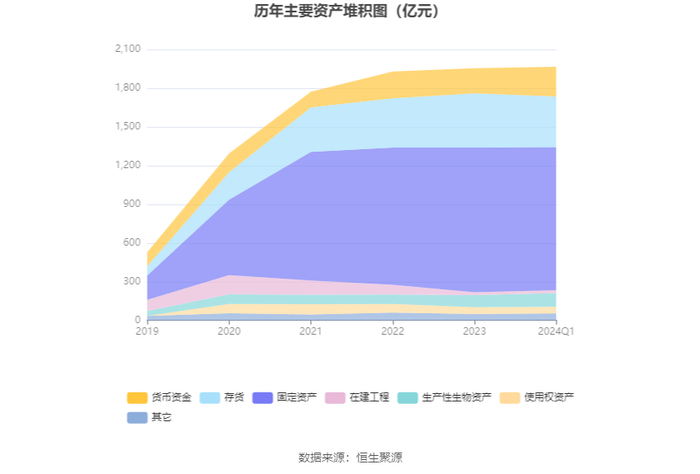 资产重大变化方面,截至2024年一季度末,公司货币资金较上年末增加18.50%,占公司总资产比重上升1.77个百分点;存货较上年末减少6.20%,占公司总资产比重下降1.46个百分点;固定资产较上年末减少1.22%,占公司总资产比重下降1.06个百分点;生产性生物资产较上年末增加14.19%,占公司总资产比重上升0.64个百分点。