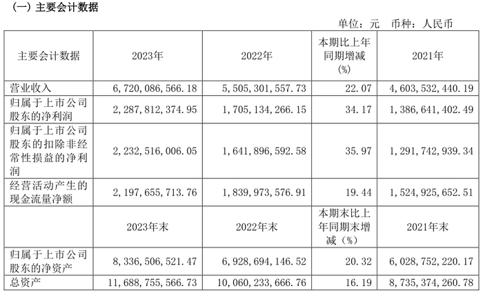 4月25日晚间,安徽省内销量排名第二的迎驾贡酒发布年度报告。数据显示,2023年全年公司实现营业收入67.2亿元,同比提升22.07%;归属于上市公司股东的净利润为22.88亿元,同比提升34.17%;经营活动产生的现金流量净额为21.98亿元,同比提升19.44%。