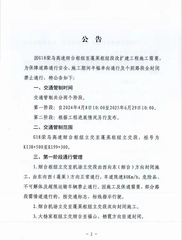 G18荣乌高速“烟台—蓬莱”枢纽段启动改扩建施工,会对龙青高速、文莱高速、烟海高速产生影响。