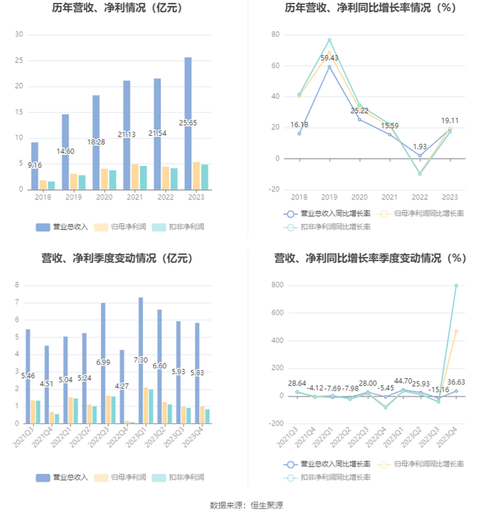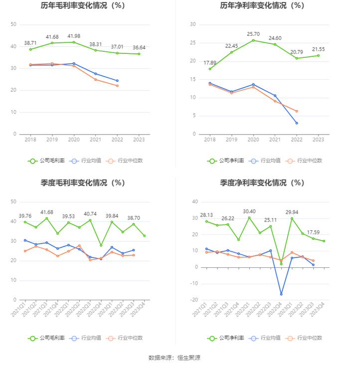 2023年,公司毛利率为36.64%,同比下降0.37个百分点;净利率为21.55%,较上年同期上升0.76个百分点。从单季度指标来看,2023年第四季度公司毛利率为32.77%,同比上升4.90个百分点,环比下降5.93个百分点;净利率为16.10%,较上年同期上升14.11个百分点,较上一季度下降1.49个百分点。
