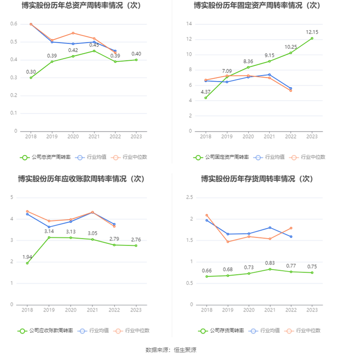 营运能力方面,2023年,公司公司总资产周转率为0.40次,上年同期为0.39次(2022年行业平均值为0.45次,公司位居同行业14/22);固定资产周转率为12.15次,上年同期为10.25次(2022年行业平均值为5.61次,公司位居同行业4/22);公司应收账款周转率、存货周转率分别为2.76次、0.75次。