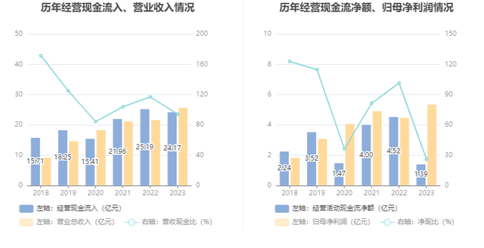 2023年,公司营业收入现金比为94.23%,净现比为26.04%。