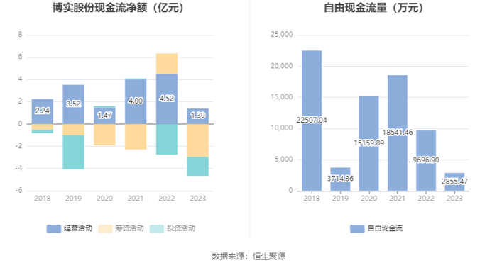 2023年,公司经营活动现金流净额为1.39亿元,同比下降69.23%;筹资活动现金流净额-2.94亿元,同比减少4.77亿元;投资活动现金流净额-1.72亿元,上年同期为-2.75亿元。