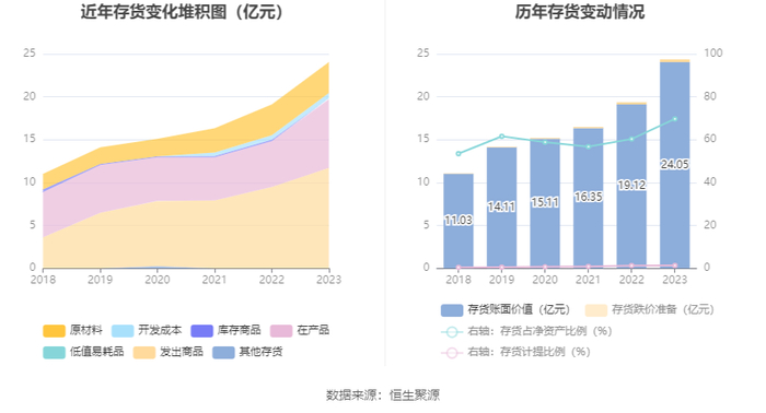 从存货变动来看,截至2023年年末,公司存货账面价值为24.05亿元,占净资产的69.71%,较上年末增加4.93亿元。其中,存货跌价准备为3196.8万元,计提比例为1.31%。