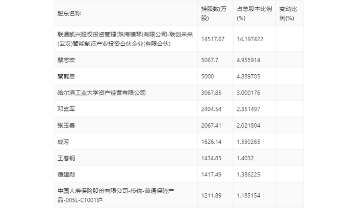 年报显示,2023年年末公司十大流通股东中,持股最多的为联通凯兴股权投资管理(珠海横琴)有限公司-联创未来(武汉)智能制造产业投资合伙企业(有限合伙),占比14.20%。十大流通股东名单相比2023年三季报维持不变。在具体持股比例上,成芳、谭建勋、中国人寿保险股份有限公司-传统-普通保险产品-005L-CT001沪持股有所上升,联通凯兴股权投资管理(珠海横琴)有限公司-联创未来(武汉)智能制造产业投资合伙企业(有限合伙)、蔡志宏、蔡鹤皋、哈尔滨工业大学资产经营有限公司、邓喜军、张玉春持股有所下降。