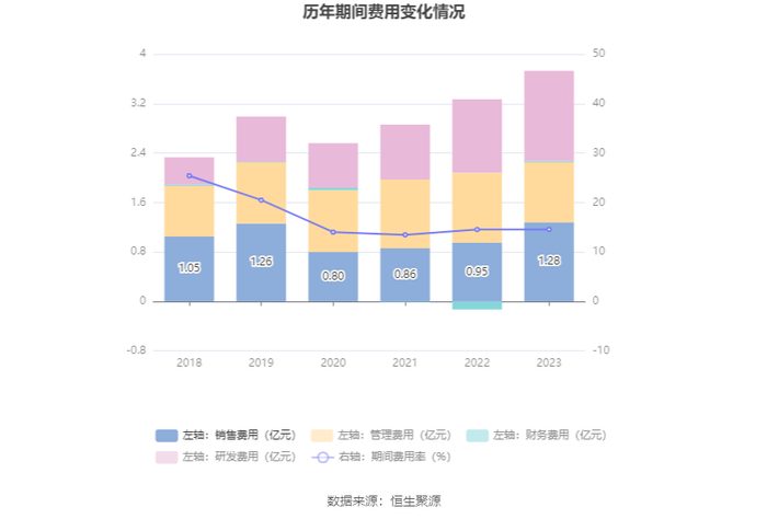 2023年,公司期间费用为3.73亿元,较上年同期增加6032.20万元;期间费用率为14.55%,较上年同期上升0.02个百分点。其中,销售费用同比增长35.95%,管理费用同比下降14.01%,研发费用同比增长22.91%,财务费用由去年同期的-1314.06万元变为182.31万元。