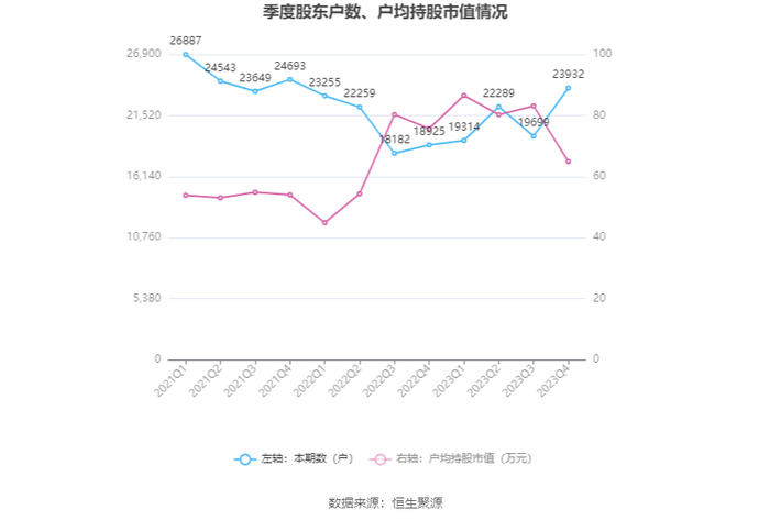 筹码集中度方面,截至2023年年末,公司股东总户数为2.39万户,较三季度末增长了4233户,增幅21.49%;户均持股市值由三季度末的83.11万元下降至64.90万元,降幅为21.91%。