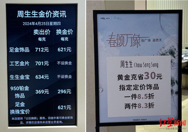 而在成都万象城,谢瑞麟目前挂牌金价713元/克,目前“五一”活动克减60元,实际售价为653元/克。而周生生挂牌价712元/克,较最高点739元/克下降27元/克。目前每克还可优惠30元,也就是实际卖价为682元/克。后续叠加商场“五一”活动,每克可以优惠55元。
