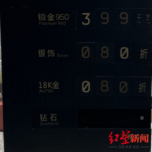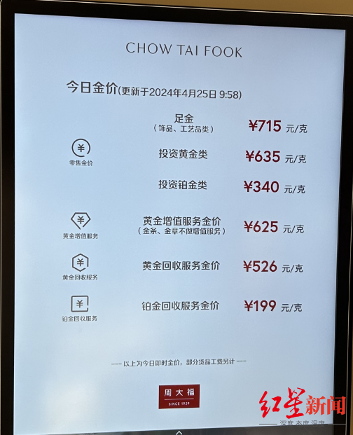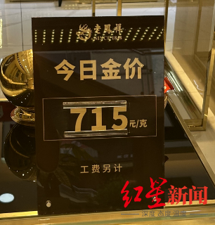 25日晚些时候,红星新闻记者又来到春熙路银石广场,周大福的挂牌金价为715元/克。据店员介绍,此前最高的挂牌价为738元/克,目前降幅为23元/克。实际售价方面,目前每克可优惠5元,为710元/克,但“五一”期间暂时没有优惠活动推出。