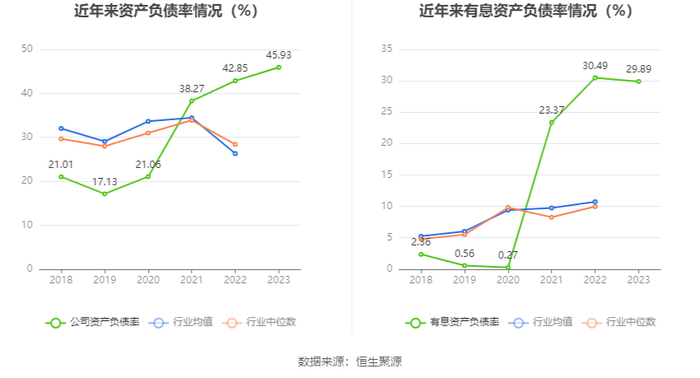 在偿债能力方面,公司2023年年末资产负债率为45.93%,相比上年末上升3.08个百分点;有息资产负债率为29.89%,相比上年末下降0.60个百分点。