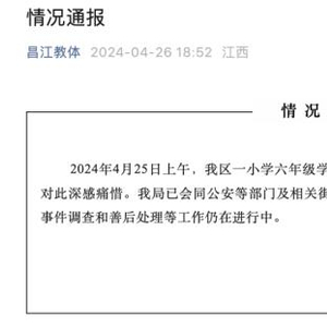 4月25日,江西省景德镇市第十一小学一名学生在校跳楼身亡。26日,景德镇市昌江区教体局发布通报称,成立联合调查组,依法开展调查核实工作。