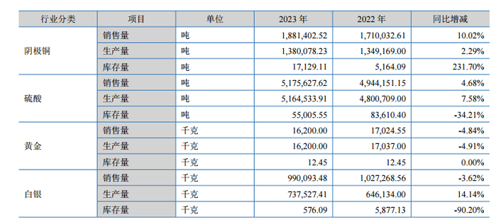 云南铜业表示:1.阴极铜库存量比上年同比增加231.70%,主要由于西南铜业搬迁,增加部分库存以保障部分下游客户短期用量需求,以便有过渡期组织新的货源;2.白银库存量比上年同期降低90.20%,主要由于生产的白银产品及时销售,库存正常减少。3.硫酸库存量同比降低34.21%,主要是2023年末硫酸市场情况较好,下游客户需求较强,客户采购意愿较强,所以库存较上一年低。