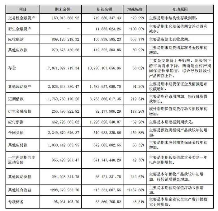 云南铜业一季度主要资产、负债项目变动情况分析