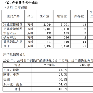 报告中提到,2023年,公司结合市场变化,确保公司效益最大化。全面推进汽车板出口,全年汽车板出口创历史新高,高附加值产品大幅增长,携手国际知名车企整合上下游优势,打造新型伙伴关系;硅钢出口以跨国变压器集团及新能源、汽车用户为核心,加大新市场开拓力度,出口数量持续增长、出口结构进一步优化,高附加值产品比例提升显著;冷板类重点品种出口增量明显,酸洗汽车品种钢出口量同比增长62%。