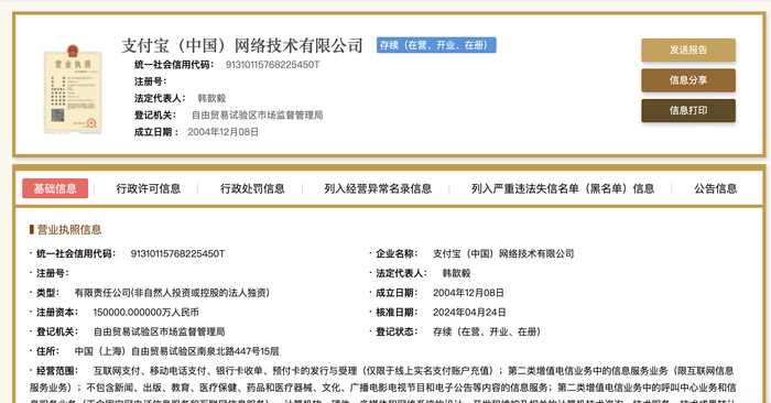 蚂蚁集团新一轮组织架构升级一个月后,支付宝法人变更为韩歆毅