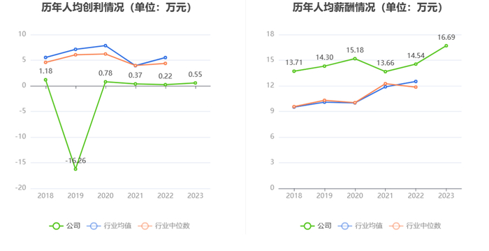 截至2023年末,公司员工总数为1570人,人均创收106.85万元,人均创利0.55万元,人均薪酬16.69万元,较上年同期分别变化-4.08%、152.07%、14.82%。