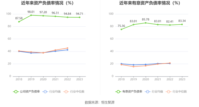 在偿债能力方面,公司2023年年末资产负债率为94.71%,相比上年末下降0.13个百分点;有息资产负债率为83.34%,相比上年末上升0.93个百分点。