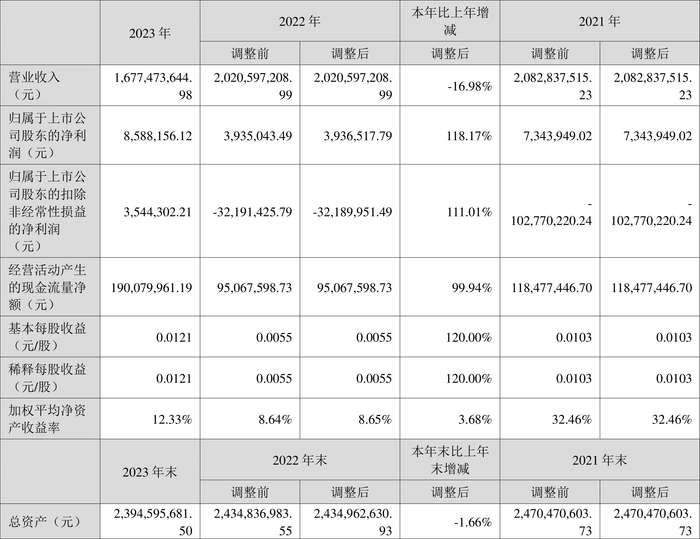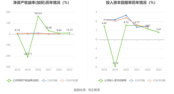 数据显示,2023年公司加权平均净资产收益率为12.33%,较上年同期增长3.69个百分点;公司2023年投入资本回报率为2.41%,较上年同期下降1.16个百分点。