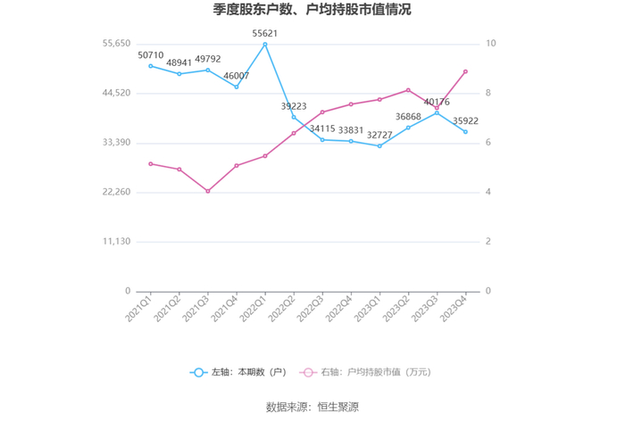 筹码集中度方面,截至2023年年末,公司股东总户数为3.59万户,较三季度末下降了4254户,降幅10.59%;户均持股市值由三季度末的7.42万元上升至8.89万元,增幅为19.81%。