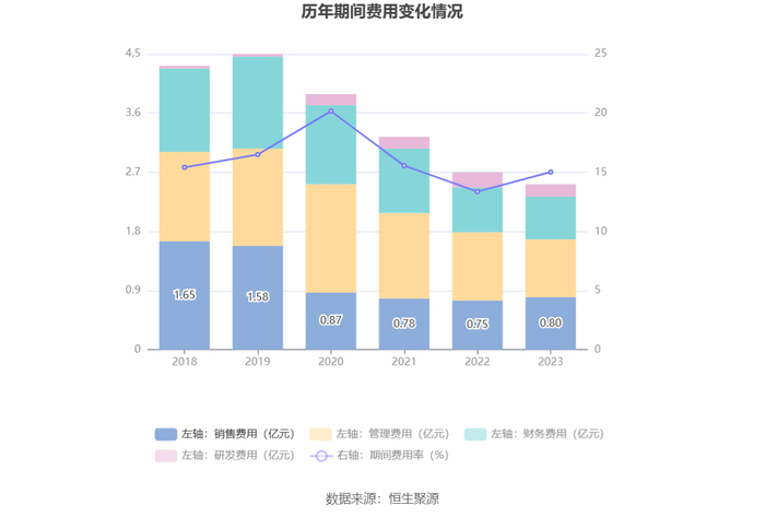 2023年,公司期间费用为2.52亿元,较上年同期减少1826.46万元;但期间费用率为15.02%,较上年同期上升1.65个百分点。其中,销售费用同比增长6.34%,管理费用同比下降15.37%,研发费用同比下降14.76%,财务费用同比下降5.42%。