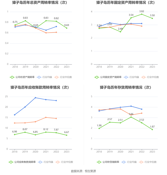 营运能力方面,2023年,公司公司总资产周转率为0.69次,上年同期为0.82次(2022年行业平均值为0.72次,公司位居同行业43/112);固定资产周转率为3.50次,上年同期为3.82次(2022年行业平均值为3.11次,公司位居同行业43/112);公司应收账款周转率、存货周转率分别为6.67次、1.87次。