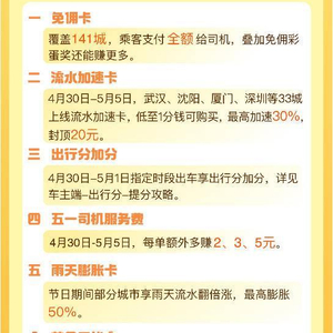 假期期间司机可享完单奖、雨天膨胀卡流水最高涨50%等丰富奖励活动,助力司机假期单多奖励多,提升收入。同时平台继续在部分城市试行节假日司机服务费,缓解假期供需紧张,鼓励师傅们出车服务,一起保障节假日出行需求。4月30日至5月1日期间,司机在指定时段出车,享出行分额外加分0.15至0.4分,累计最高可加0.9分。