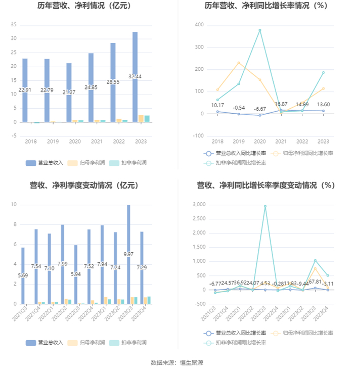 2023年,公司毛利率为22.97%,同比上升7.74个百分点;净利率为8.01%,较上年同期上升3.75个百分点。从单季度指标来看,2023年第四季度公司毛利率为30.37%,同比上升13.94个百分点,环比上升9.63个百分点;净利率为9.30%,较上年同期上升4.19个百分点,较上一季度上升2.22个百分点。