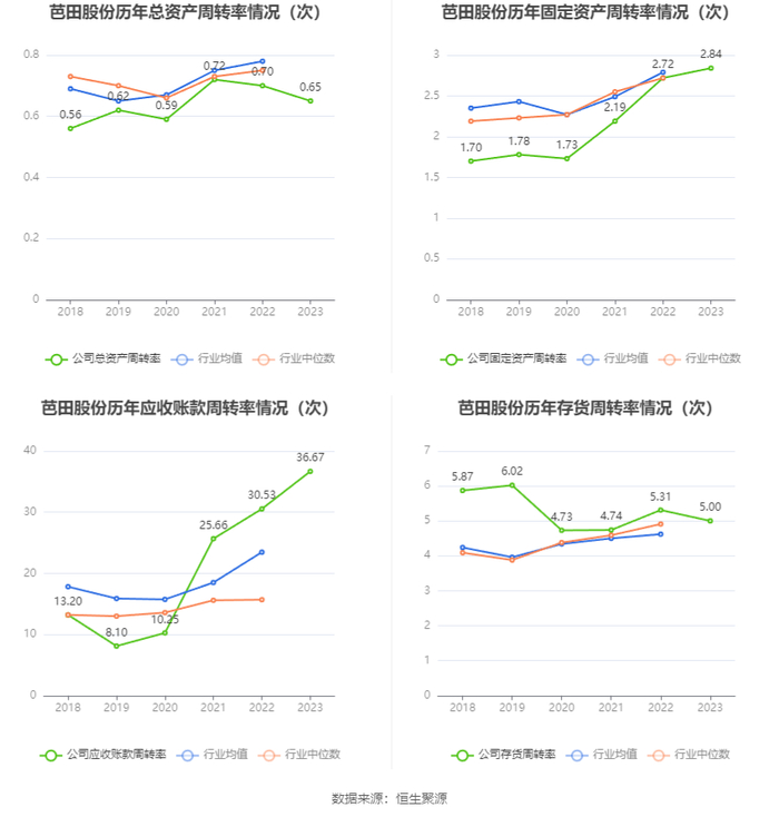 营运能力方面,2023年,公司公司总资产周转率为0.65次,上年同期为0.70次(2022年行业平均值为0.78次,公司位居同行业35/59);固定资产周转率为2.84次,上年同期为2.72次(2022年行业平均值为2.79次,公司位居同行业30/59);公司应收账款周转率、存货周转率分别为36.67次、5.00次。