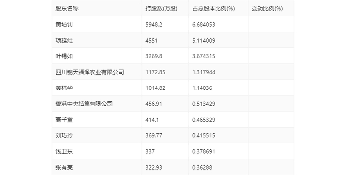 年报显示,2023年年末公司十大流通股东中,新进股东为张有亮,取代了三季度末的南方基金稳健增值混合型养老金产品-招商银行股份有限公司。在具体持股比例上,黄培钊、项延灶、叶锡如、四川锦天福泽农业有限公司、黄林华、香港中央结算有限公司、高千童、刘巧玲、钱卫东持股有所下降。