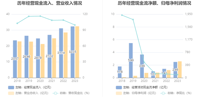 2023年,公司营业收入现金比为99.74%,净现比为95.84%。
