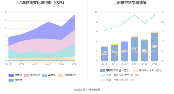 从存货变动来看,截至2023年年末,公司存货账面价值为5.73亿元,占净资产的23.6%,较上年末增加1.47亿元。其中,存货跌价准备为3111.96万元,计提比例为5.15%。