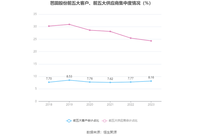 报告期内,公司前五大客户合计销售金额2.65亿元,占总销售金额比例为8.16%,公司前五名供应商合计采购金额5.61亿元,占年度采购总额比例为24.31%。