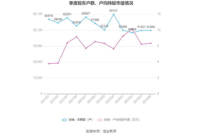 筹码集中度方面,截至2023年年末,公司股东总户数为5.19万户,较三季度末下降了62户,降幅0.12%;户均持股市值由三季度末的9.36万元上升至9.52万元,增幅为1.71%。