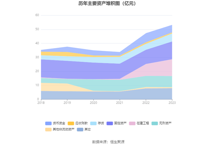 资产重大变化方面,截至2023年年末,公司在建工程较上年末增加41.64%,占公司总资产比重上升4.61个百分点;货币资金较上年末减少17.77%,占公司总资产比重下降3.75个百分点;固定资产较上年末增加25.35%,占公司总资产比重上升2.43个百分点;无形资产较上年末减少0.51%,占公司总资产比重下降1.97个百分点。