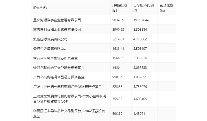 一季报显示,2024年一季度末公司十大流通股东中,持股最多的为重庆鸿顺祥泰企业管理有限公司,占比19.24%。十大流通股东名单相比2023年年报维持不变。在具体持股比例上,香港中央结算有限公司、诺安成长混合型证券投资基金、银河创新成长混合型证券投资基金持股有所上升,华夏国证半导体芯片交易型开放式指数证券投资基金持股有所下降。