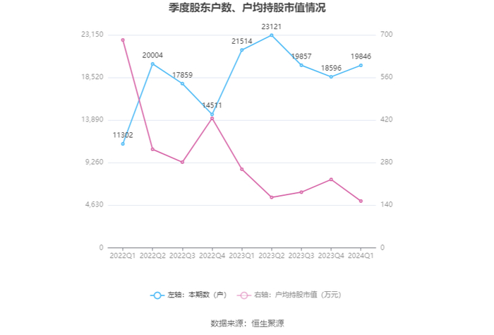 筹码集中度方面,截至2024年一季度末,公司股东总户数为1.98万户,较上年末增长了1250户,增幅6.72%;户均持股市值由上年末的224.79万元下降至153.86万元,降幅为31.55%。