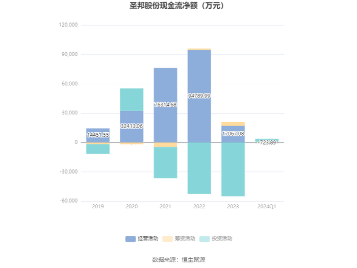 2024年第一季度,公司经营活动现金流净额为-723.89万元,同比增加1.63亿元;筹资活动现金流净额801.77万元,同比减少4303.54万元;投资活动现金流净额3034.81万元,上年同期为-2.01亿元。