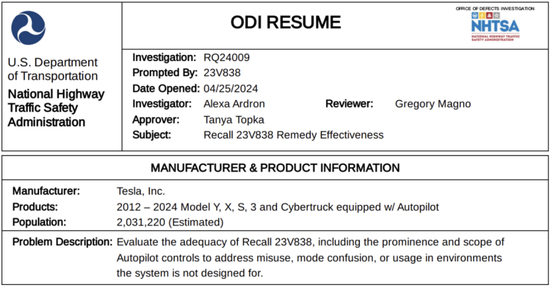 NHTSA在结束对Autopilot 近三年的调查后进行了新的调查,称其发现证据表明“特斯拉薄弱的驾驶员参与系统不适合 Autopilot 的宽松操作能力”,从而导致“严重的安全漏洞”。