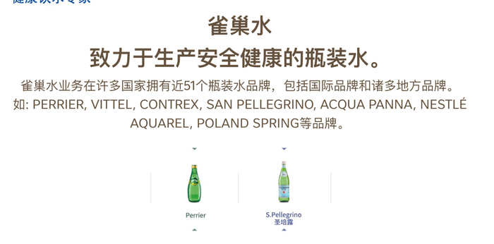 根据雀巢官网,雀巢水业务在全球拥有近51个瓶装水品牌,包括国际品牌和诸多地方品牌,包括PERRIER(巴黎水)、VITTEL(伟图)、CONTREX(康婷)、SAN PELLEGRINO(圣培露)、 ACQUA PANNA(普娜), 以及NESTLé AQUAREL(西班牙市场)、POLAND SPRING(北美市场)等品牌。