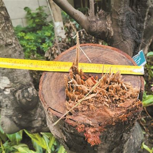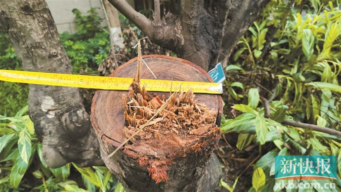 绿化树木被“过度修剪”甚至遭到砍伐的情况并不少见。新快报记者了解到,在天河区某小区当中也有这样一棵“砍头树”,秦新生表示,该树木目前处于濒临枯死的状态,其生态价值和效益均严重受损,可以向所辖街道或园林局上报处理。