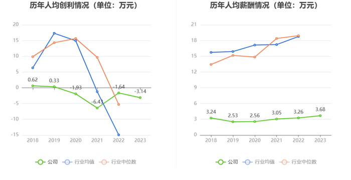 截至2023年末,公司员工总数为50107人,人均创收10.78万元,人均创利-3.14万元,人均薪酬3.68万元,较上年同期分别变化-10.81%、-91.22%、12.93%。