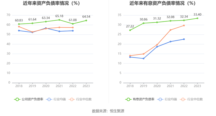 在偿债能力方面,公司2023年年末资产负债率为64.54%,相比上年末上升3.46个百分点;有息资产负债率为33.40%,相比上年末上升1.06个百分点。