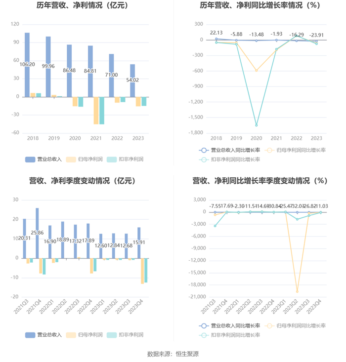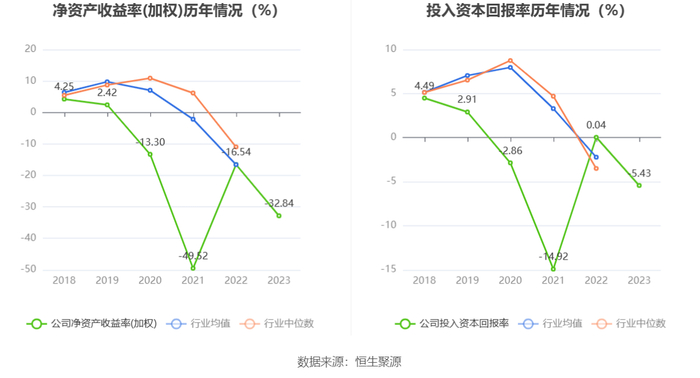 数据显示,2023年公司加权平均净资产收益率为-32.84%,较上年同期下降16.30个百分点;公司2023年投入资本回报率为-5.43%,较上年同期下降5.47个百分点。