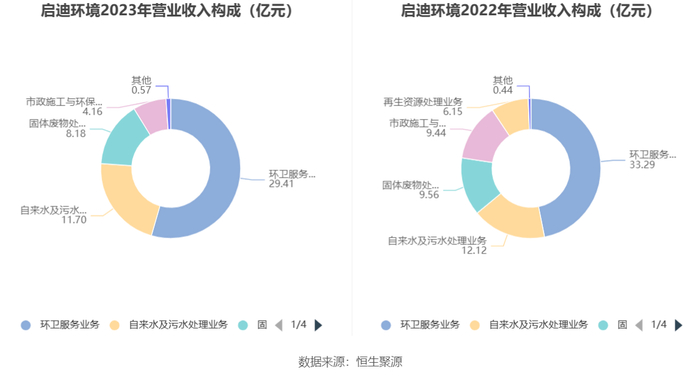 分产品来看,2023年公司主营业务中,环卫服务业务收入29.41亿元,同比下降11.66%,占营业收入的54.44%;自来水及污水处理业务收入11.70亿元,同比下降3.41%,占营业收入的21.67%;固体废物处理业务收入8.18亿元,同比下降14.47%,占营业收入的15.14%。