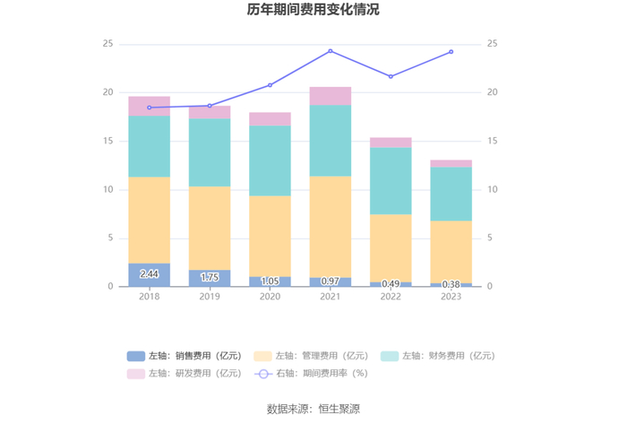 2023年,公司期间费用为13.09亿元,较上年同期减少2.30亿元;但期间费用率为24.23%,较上年同期上升2.55个百分点。其中,销售费用同比下降21.83%,管理费用同比下降7.93%,研发费用同比下降28.54%,财务费用同比下降19.58%。