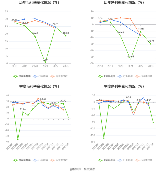 2023年,公司毛利率为18.68%,同比下降5.93个百分点;净利率为-29.74%,较上年同期下降18.67个百分点。从单季度指标来看,2023年第四季度公司毛利率为2.51%,同比下降23.44个百分点,环比下降23.26个百分点;净利率为-92.02%,较上年同期下降49.09个百分点,较上一季度下降87.67个百分点。