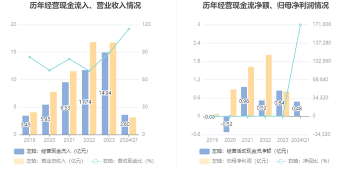 2024年第一季度,公司营业收入现金比为115.18%,净现比为171491.20%。