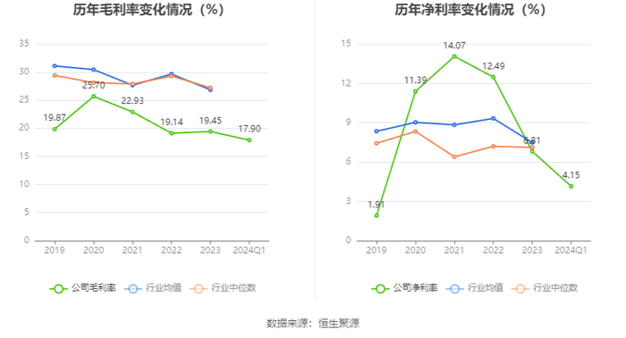 2024年第一季度,公司毛利率为17.90%,同比上升0.34个百分点;净利率为4.15%,较上年同期下降5.58个百分点。