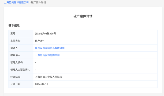 记者查询某眼查发现,MJstyle关联公司上海笕尚服饰有限公司(以下简称“笕尚服饰”)的确已被申请破产清算,申请人为南京汉帛国际贸易有限公司,受理法院为上海市第三中级人民法院。